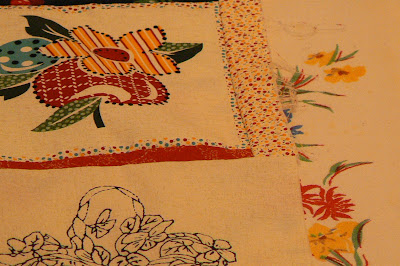Zone 2-the dining room, I'm loading up a quilt top, Kitchen Roosters, from my basket I weighed in with last year and never finished.  I was looking for some backing material in my stash when I ran across this lovely vintage table cloth It's quite old and has seen better days, but, maybe on the back of a retro fabric style top, it will find new life.  It's a tad small, but we quilters are good at making things work.  I'll probably cut the wider sides off and sew to the bottom and top.